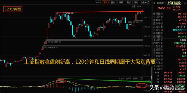在昨日文章《A股长阳强突3400点,距离新高仅剩一步之遥,明天还能大涨吗?》中达哥提示过——“后面我们需要重点留意的就是120分钟周期和日线级别的技术背离,当然上述两大周期要想形成背离,必须要指数突破站稳3451点才行(收盘价),因为MACD指标是以收盘价来作计算标准的。”今天上证指数报收3451.09点,按照MACD指标的背离用法来讲,120分钟和日线已经初步形成技术背离走势,而且上述两大周期的背离级别相当大,除非市场再现7月初的加速逼空,否则短期想要消化是比较困难的事情,大周期+大级别背离,这是我们后市要引起重视的风险信号。