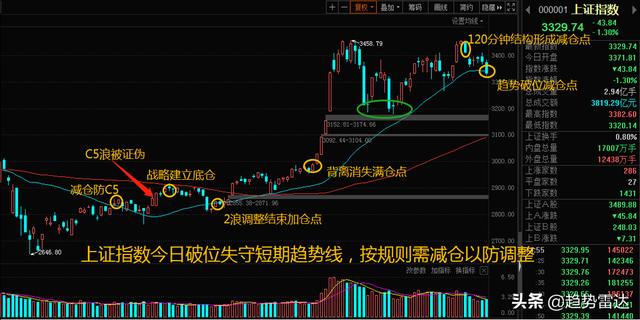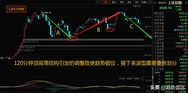 起码我们一步步都是按规则来执行的,什么时候做什么事情,清清楚楚明明白白,不主观不幻想,自然就能做到稳定盈利了,这里减仓对比3200恐慌割肉的人而言,遵守规则的优越性其实已经一目了然了。下面结合120分钟周期给大家说说后市的调整路线,达哥前文说过所有的卖出都是为了后市更好的买入,同样的道理所有的买入都是为了在更高位卖出,这里我们已经做的很不错了,后面需要解决的就是在何时买回的问题了。