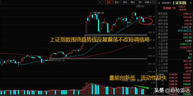继昨日上证指数失守短期趋势线后,今天又被收复了,但是这种收复没有意义,一方面量能再创新低,完全是破位之后的修复反弹,大概率是中继下跌信号;另一方面这里趋势破位是因120分钟顶背离结构引发的调整导致的破位,所以相对而言结构没有失效之前这里还难以直接判断趋势被有效收复!