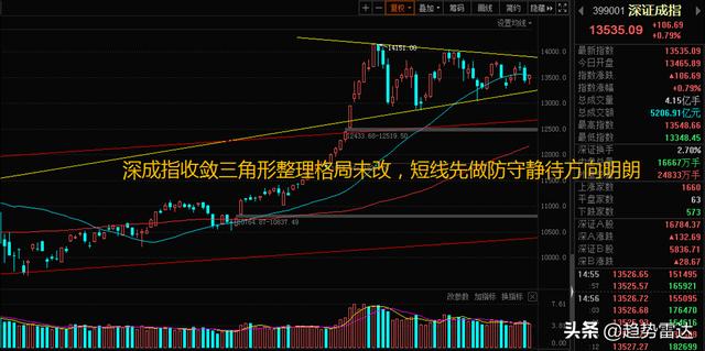 深成指方面看,今天的缩量弱反并未能直接收复短期趋势线,从图形上看也还是在收敛三角形整理区间,还是如我们前文所讲,结构是偏左侧交易,趋势是偏右侧交易,相对来讲由于深成指这里的震荡空间偏窄,所以结构和趋势的空间没有拉开,但是能够在前高附近给我们这种信号已经是非常舒服的减仓区域了。虽然图形不是交易信号,也只是辅助分析的手段之一,但是就如达哥刚刚所讲,你总要选取一根均线或者其它的技术指标作为你的出场点和进场点,因为盈亏同源,你只要能够坚定按照你的交易计划去执行,总能赚到属于你应该赚的钱。