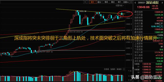 今天深成指基本已经非常接近收敛三角形的上轨线了,经过长达一个半月的蓄势整固之后,一旦这里形成突破,短线行情会比较可观。原本这种技术形态就是多空观望情绪浓厚所致,但是随着调整周期的延长以及规模的扩大化,这里一旦选择方向都会是短线加速点,毕竟方向明朗后对场外资金或者说是观望资金天然就会产生一种吸引力。需要重点留意的是这里的突破必须得放量,量能最少要放大至万亿级别以上,毕竟有量配合的突破会更加踏实!