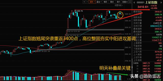 很多人对尾盘进攻表示很担忧,总觉得是主力资金实力不够有“偷鸡”嫌疑,其实这个真的要结合趋势来进行分析,在上升趋势中的尾盘偷袭基本是资金试盘举动,譬如今天尾盘发动券商+科技股,基本没有任何阻力就把指数拉回到3400点上方,换句话说这里阻力相对很小了,明天上述两大板块如若能够扛起领涨大旗,基本大盘突破创新高应该就没有太大悬念了!