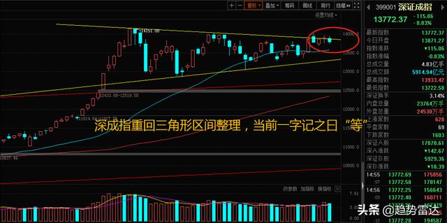 深成指方面也没啥好说的,昨日虽然放量收十字星站上了三角形上轨线,但是今天马上就跌回了原本的震荡区间,好在大盘指数一直是维持在趋势线上方震荡,这里整体就一个字——“等”。这里有且只有两种走势:1、要么向上突破,量价配合理想的话大概率有新一轮加速上涨行情出现,我们目前阶段是围绕趋势线重仓持股待涨,花点时间等待不算啥;2、如果方向是向下破位,从技术面看也是上升趋势中的正常调整,而且按照收敛三角形整理来看,这种基本也会形成最后一跌,应对也很简单,趋势破位继续减仓,等最后一跌完成后再把筹码接回来就可以了。