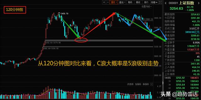 那么我们现在需要判断的就是C浪何时调整结束了!按照波浪理论定义来讲,C浪是必须要创新低的,也就是说A浪低点3174.66点需要破位才能确立这里的C浪调整!目前把C浪进一步细分的话,可以明显看到是123浪式的下跌,3浪对比1浪明显是主跌浪,所以达哥认为C浪大概率是走5浪级别的下跌,这点应该能够理解吧!