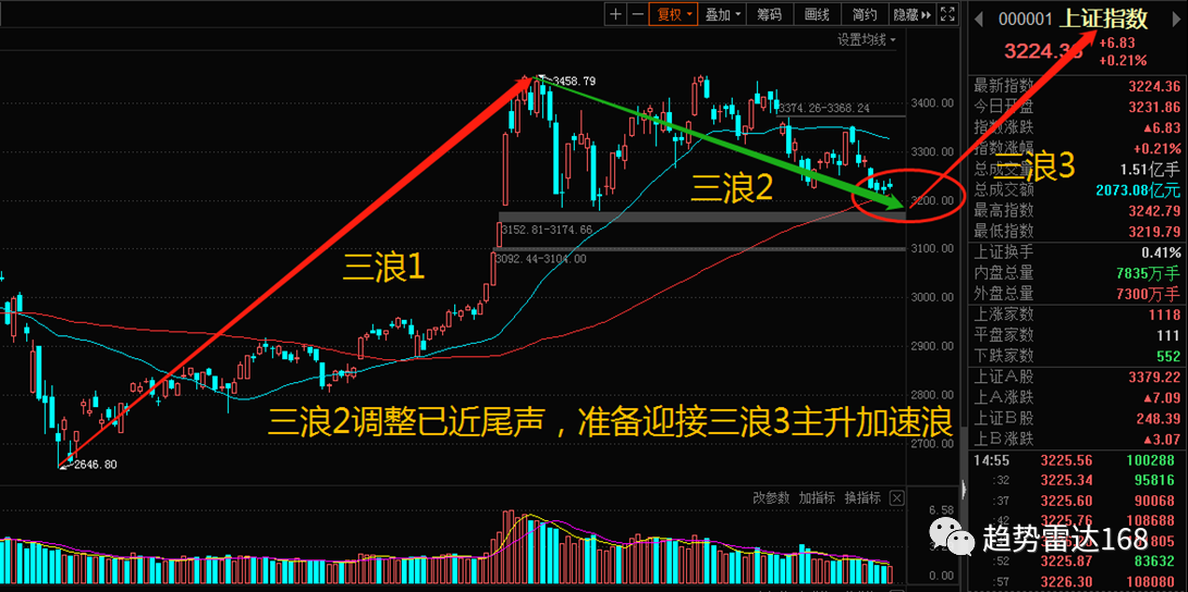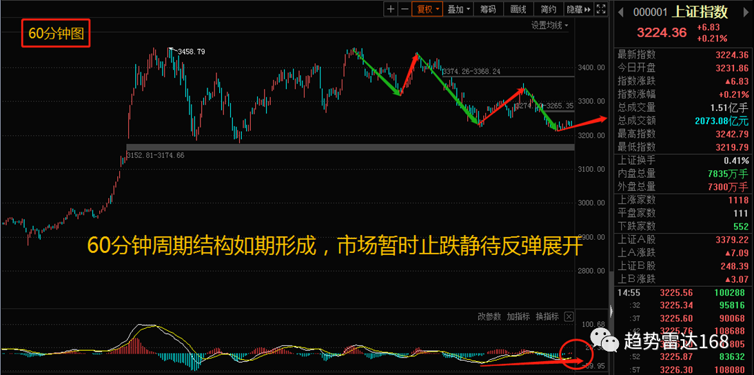我们现在需要找的也只是三浪2的调整低点而已,这里回踩长期趋势线暂获支撑企稳,同时配合小周期5浪+结构的共振效应,不管是趋势线、还是结构,又或是浪型走完了一波完整5浪,结合上述技术条件分析来讲,达哥认为昨天的低点已经是技术面确定性最强,安全边际最高的抄底点位了。即便今天市场只是收出了一根假阴线而已,并没有收中阳,也没有站稳3250点之上,但是请注意这里只是左侧进攻点而已,左侧是逆势抄底,考验的是技术眼光和勇气决心,否则等你看到趋势走出来后就不是左侧打法了。