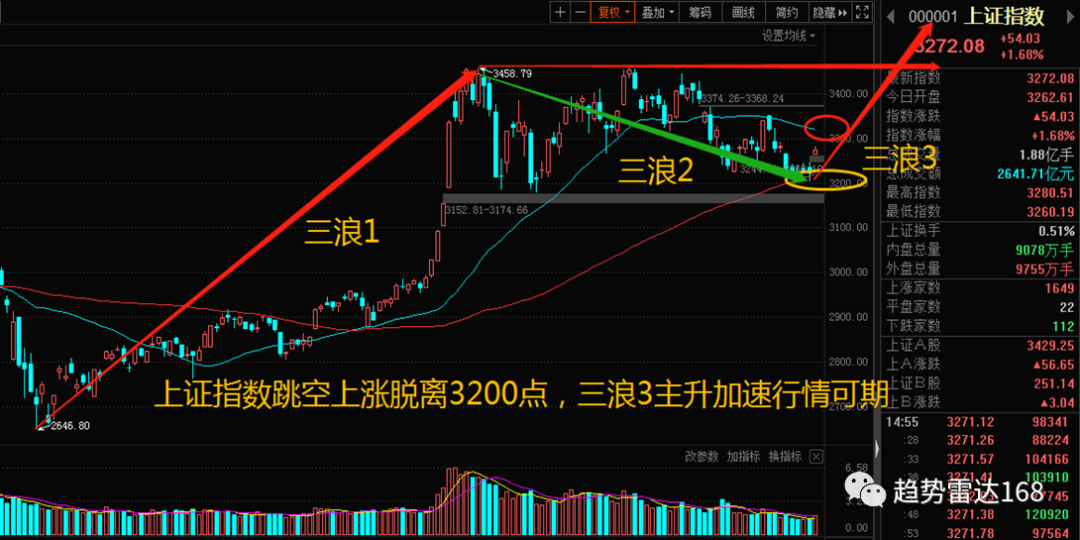 结合上证指数日线图来看,大家应该可以看得很清楚,三浪2的调整在长期趋势线之上如期止跌企稳,今天的跳空高开高走则开始逐步远离3200点底部区域。虽然说现在三浪3的上升趋势还没有正式形成,但是不可否认,一旦60分钟和120分钟底背离结构引发的反弹能够突破短期站稳短期趋势线,那么随后进一步突破3458.79点再创新高也只是时间问题而已。达哥是根据5浪低点+结构判断的左侧进攻信号,右侧满仓进攻点是突破短期趋势线,对比来讲,怎么都要比突破3458.79点确立三浪3主升浪后再去追涨要舒服的多吧!