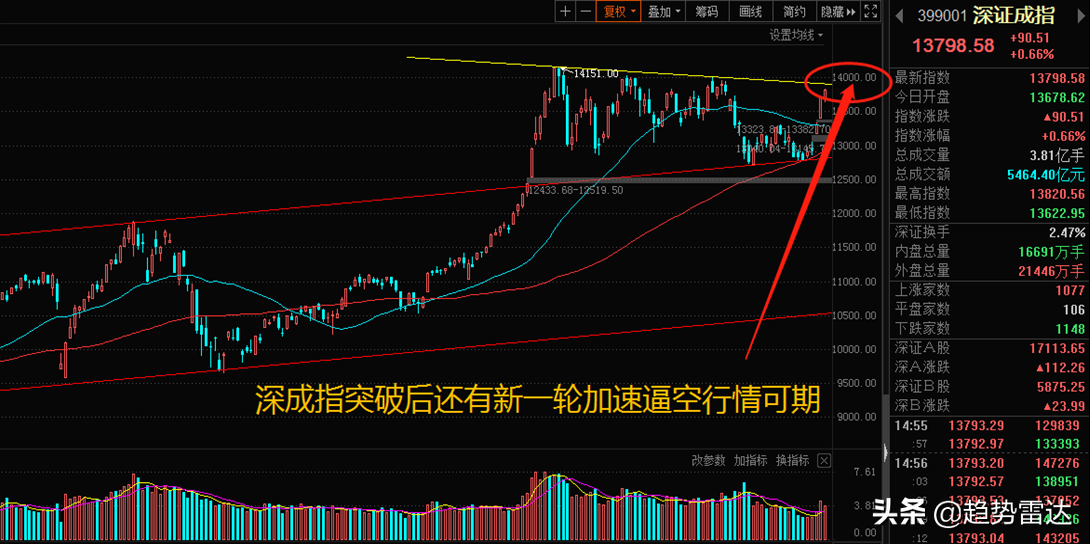 至于深成指这里要特别强调一句,目前深成指进攻三红兵已经逼近前期压力线附近,按照现在这种走势的话,要么趋势线之下蓄势整固后再突破爆发,要么突破后回踩确认再走加速,当然这两种情况对于已经进场的我们而言,没有太大的影响,蓄势突破的话耐心持股就完了,突破回踩做下高低切换应对,但是整体仓位还是不减不退的!