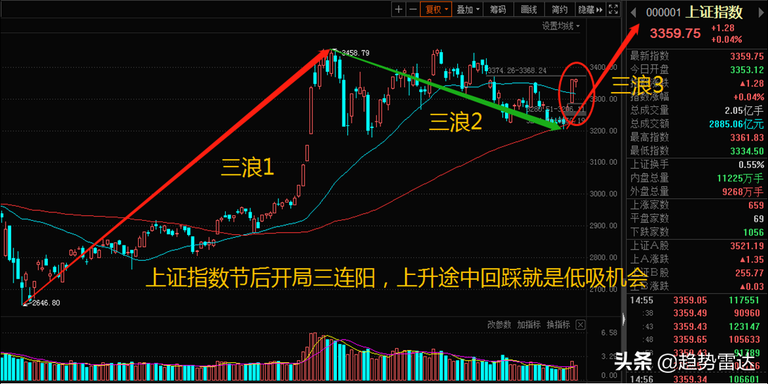 今天A股探底回升收小阳线,量能同比明显萎缩,逼空行情开始有减速征兆。不过相对比节前来讲,节后三连阳已经属于梦幻开局了,达哥整体观点还是不变,金秋十月行情仍可期待,大家实在不需要过多恐慌和担忧!其实昨日达哥文章就提醒过连续逼空普涨后市场大概率有震荡分化风险,抛开券商利空以及港股休市因素影响,今天能够延续收阳已经足以说明市场属于强势而非弱势,再次强调一遍,三浪2后面可是三浪3主升加速浪,本周目标看高一线至3400点!