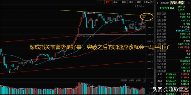 昨天结合深成指给大家说了短线的两种走势推演,今天市场没有选择趁势突破,而是主动选择关前蓄势的话,其实是好事,起码能够给与踏空资金从容进场的机会,否则真的是走突破回踩路线的话,可能很多朋友面临的就不仅仅是踏空风险了。结合此前的三角形整理破位后,达哥强调这里是最后一跌,我们也在节前从容完成了抄底布局,那么这里再多说一句,真正的加速行情将在突破之后展开,该加的都加完了,剩下的就交给市场来验证了。