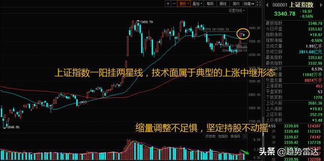 今天上证指数缩量震荡收小阴星线,节后三连阳被终结,虽然达哥预期中的向上补缺动作未能实现,但是长阳挂两星线的K线组合也还是属于典型的上涨中继形态。结合近两天的缩量整理走势来看,达哥认为技术面三浪3的主升加速看涨逻辑并没有发生任何变化,短期趋势线之上的震荡蓄势都是为了后市更好的上涨,当前坚定持股就好!