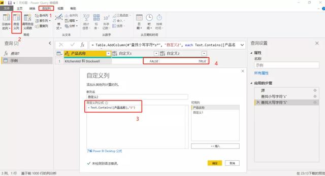 我们将上面的产品名称复制到PowerQuery中,通过“添加列”选项卡下的“自定义列”功能,新建两个新列,分别为“自定义1”列和“自定义2”列,查看编辑器返回的结果: