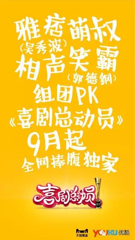 据了解,在《喜剧总动员》中,吴秀波与郭德纲这两位影视界的“泰山”与喜剧界“北斗”将在节目中带领各队队员“捉对厮杀”,这档被业内看作是最有可能超越之前喜剧“经典”的新综艺,优酷作为这档节目的独家战略合作伙伴势必将集结优势资源助攻。