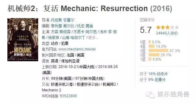 《驴得水》之所以可以逆袭成单日冠军,外部条件在于所面临的对手大多“头重脚轻”。《机械师2:复活》北美票房惨败,在豆瓣评分中也只有5.7分。虽然获得多日票房冠军,但实事求是的说,这部影片的发挥并不理想。