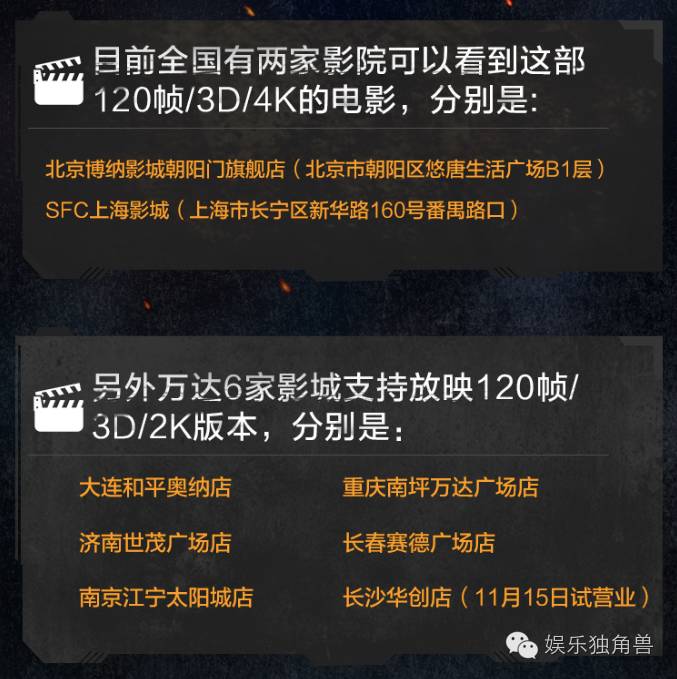 在开始聊120帧《比利林恩》的观影感受之前,先给迫不及待想亲刷电影的朋友们一个购票指南。目前电影有120帧、60帧和24帧三种规格。内地支持3D/4K/120帧放映的只有北京博纳影城朝阳门店和SFC上海影城,别嫌少,全球总共也就五家影院支持而已。另外,万达有6家影城支持放映3D/2K/120帧的版本,分别在大连、重庆、济南、长春、南京和长沙。4K和2K的区别是,前者的分辨率是后者的4倍。支持60帧放映的影院则相对较多,基本各主要城市都有。