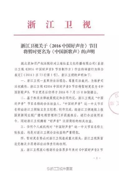 迫于版权压力,灿星最终将《2016中国好声音》改名为《中国新歌声》。