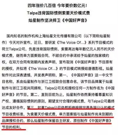 可以看出,灿星与Talpa合作得并不愉快。据灿星方面介绍,鉴于《中国好声音》在国内的迅速走红,在2013年双方第一次续约时,Talpa方面提出将版权费提高至1亿元,而前一年这一价格仅为200万元。经协商,双方最终以每年6000万元的版权费用暂时达成一致。灿星公司在此后指责荷兰方面“违背国际惯例,索要天价模式费”。