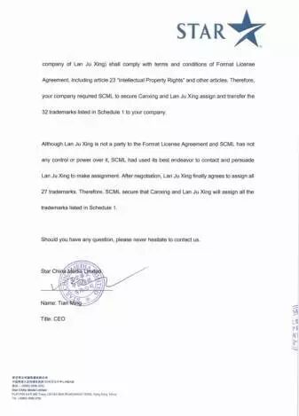 近日,星空华文传媒CEO田明亲笔签署的道歉信在网络上被曝出。内容显示,早在2015年,星空华文传媒(灿星制作母公司)就已要求并得到灿星公司和蓝巨星国际传媒公司同意,表示会将这两家公司私自注册的带有“好声音”字样的商标归还给Talpa公司。从道歉信看,借助《中国好声音》影响力抢注商标,从事衍生品经营业务,此行为未获得Talpa公司的授权和许可。