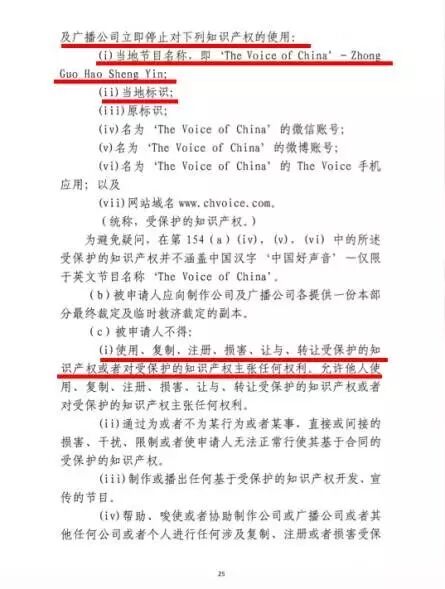 2016年6月20日,北京市知识产权法院作出裁定,责令灿星公司等单位在歌唱比赛选秀节目中的宣传、推广、海选、广告招商、节目制作过程中,立即停止使用包含“中国好声音”、“The Voice of China”字样的节目名称及相关注册商标。