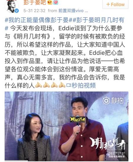 近两年,彭于晏接拍的电影题材也的确是特别的“正”,去年的《湄公河行动》到今年7月1日将要上映的《明月几时有》,艾迪说今后还要接更多的主旋律电影。选择用行动与作品说话的他,顿时就让某些无脑黑的言论显得有些可笑啦…
