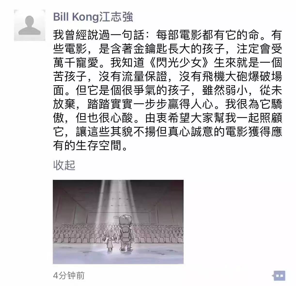 这是江志强对《闪光少女》最中肯的评价,其对影片的喜爱也在最近一系列的宣传活动上展露无遗。这位业界大佬在《闪光少女》几乎全部的发布会上,都亲自出席,且一一感谢媒体对这部影片的支持;微信朋友圈仅有的两条动态,其中之一也给了《闪光少女》。