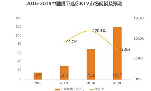 因利润较高、回本周期较短,迷你KTV被市场广泛看好。短短一两年间,除了雷石Wow屋,咪哒miniK、友唱m-bar、聆嗒miniK等诸多品牌相继入局。艾瑞咨询发布的《2017年中国线下迷你KTV专题研究报告》显示,与2016年相比,2017年中国线下迷你KTV市场规模将达到31.8亿元,增长92.7%,预计2018年将继续增长至70.1亿元,增长率达120.4%,到了2019年,市场规模将持续扩大至120亿元。