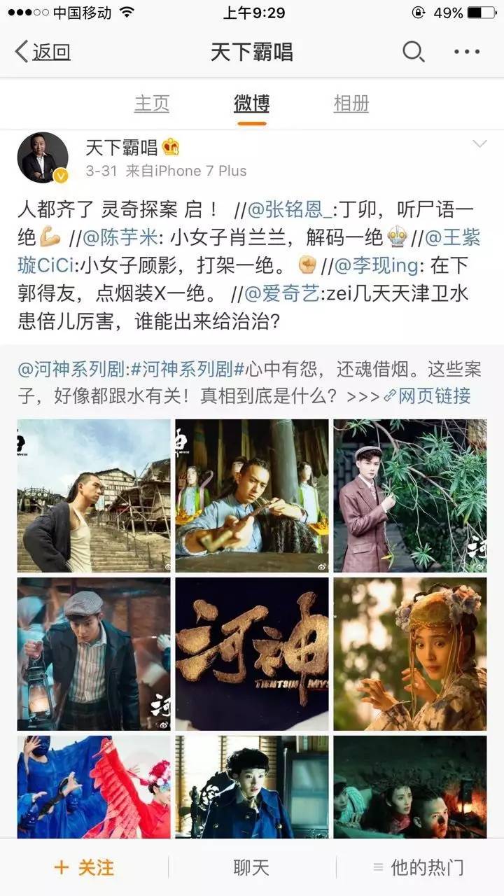与此同时,天下霸唱的另一部小说改编作品——《河神》却在近段时间逆袭,被网友“封神”。该剧在原著改编上面,被网友力赞为“小说IP改编范本,狂甩隔壁《鬼吹灯》几条街”。连原著作者天下霸唱也在媒体面前公开表示:写一部《河神》耗费的力气相当于八部《鬼吹灯》。并且他还在今年3月初就已在自己微博上为该剧宣传,而另外两部《鬼吹灯》系列作品却不见其任何宣传痕迹。
