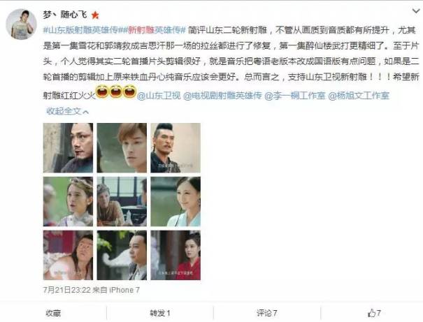 当然,这一“再度升级”迎来了观众的认可。在山东卫视播出《新射雕》后,某微博网友指出,“二轮播出不管从画质到音质都有所提升,尤其是第一季雪花和郭靖就成吉思汗那一场的拉丝都进行了修复,第一集醉仙楼武打更精细了。”同时该网友对改版后的片头首播再次提出自己的意见。