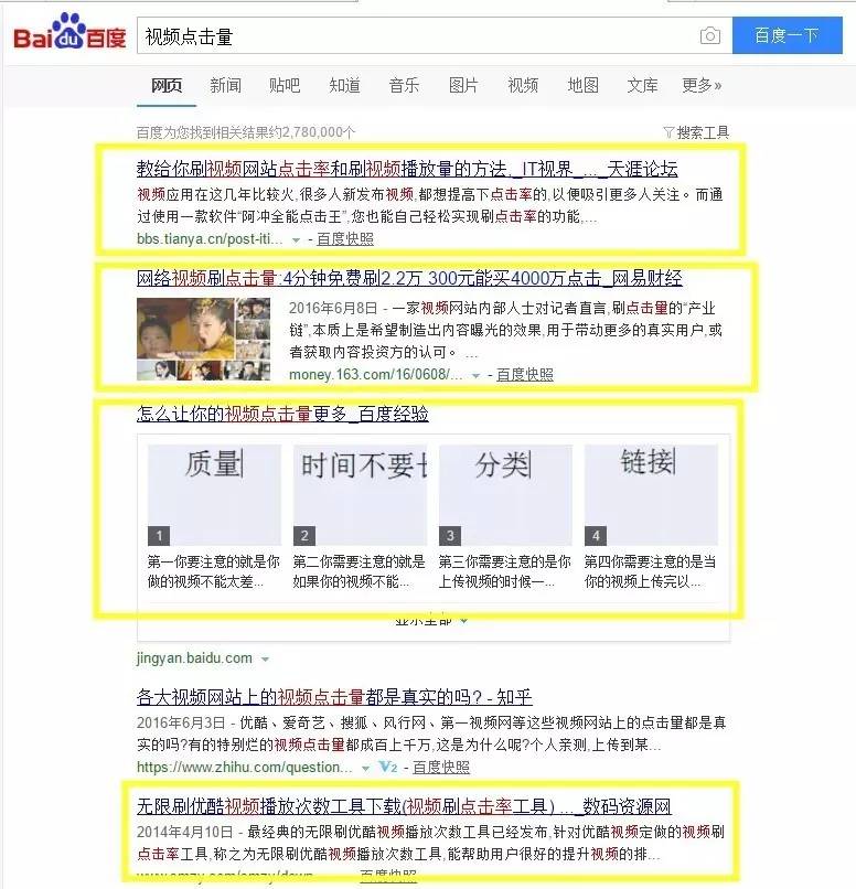 因此,当面临强大的市场需求时,市面上便开始渐渐滋生出大量的专业“造假”平台。打开百度或者淘宝搜索“视频点击率”等相关字眼,你会发现下面出现相关产品多达十页。而在淘宝中,经过统计得出,成交量排名靠前的店家多数在2015年完成注册认证,每月的成交量少则几十单,多则五六千单。