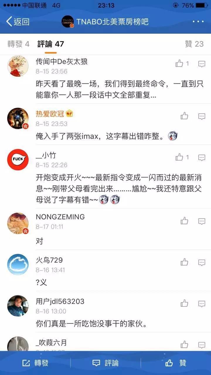 而在IMAX版本上映当天,就有不少观众反映影片字幕出现错误,“有几十秒都没有翻译,一直重复一句话”,“我们得到最终命令到只能靠你一人,这一段中文全部重复”……