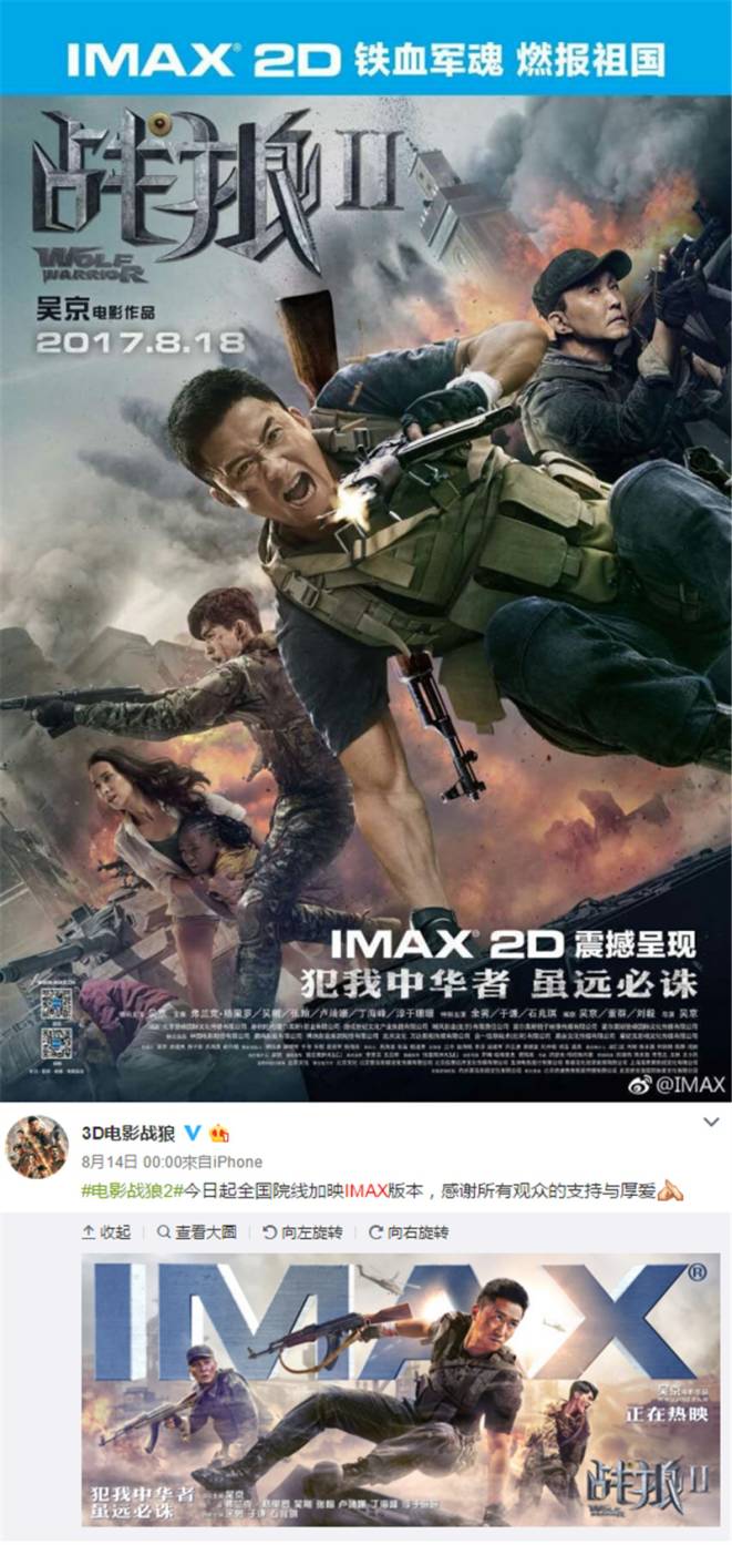 在八月初影片票房已经达到25亿时,片方发布的消息显示“影片将新增IMAX2D版本,将于8月18日上映”,不过在8月14日时,《战狼2》官微就发博称IMAX版本将于14日登陆全国IMAX影院。