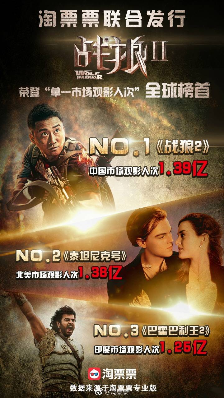昨晚八点,《战狼2》综合票房突破50亿元,用时24天,中国内地观影人次也达到了1.4亿,据影片联合发行方淘票票官微发布消息,1.4亿人次也成为1990年以来单一市场单部影片观影人次冠军。