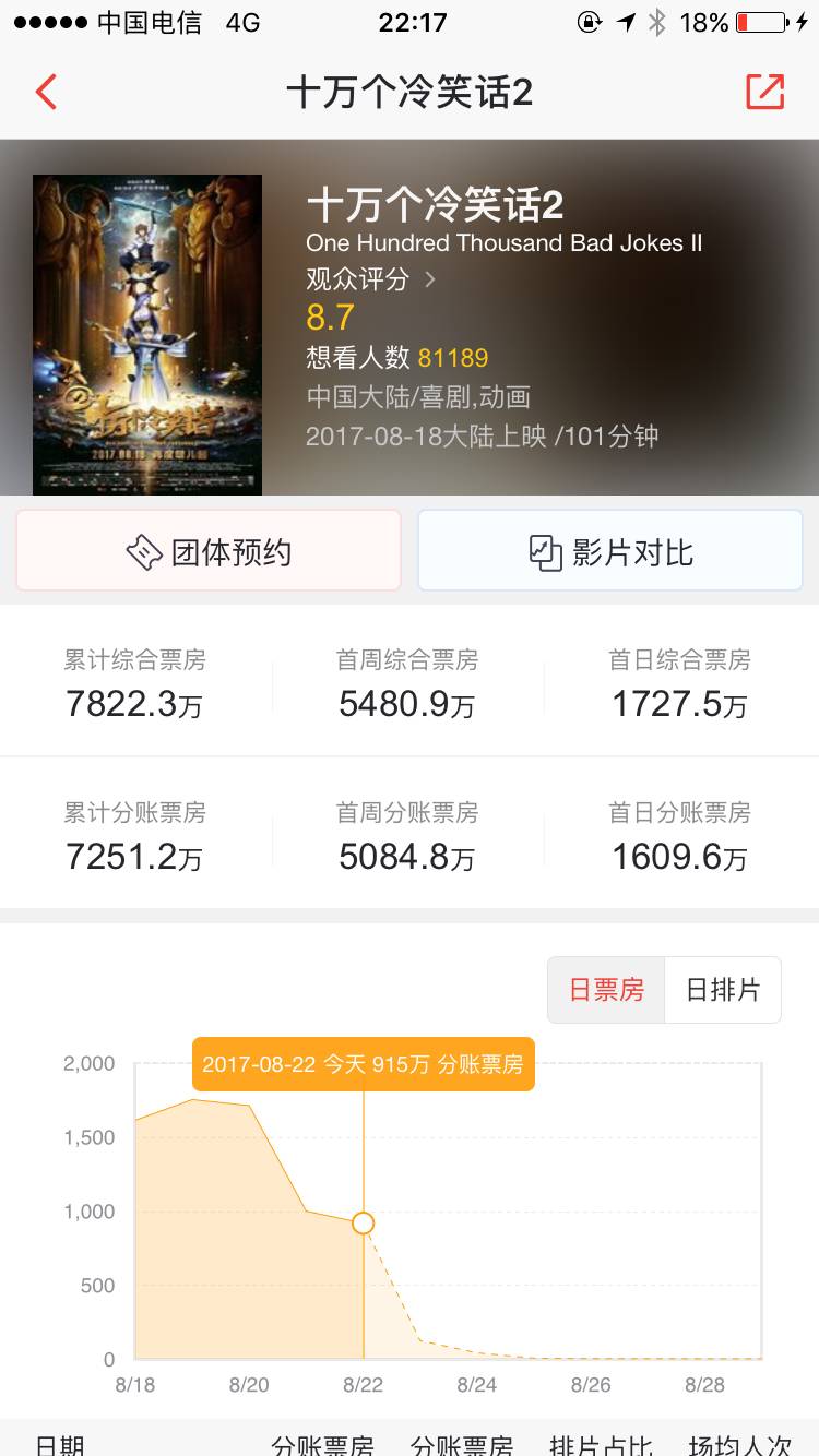 2015年《十冷1》以1000万的制作成本换回了1.2亿票房,成为动画电影以小博大、票房逆袭的教科书式案例之一,它不仅让公众意识到二次元网络IP已经从边缘走向主流,也让电影行业看见了成人动画电影的潜在市场。虽然电影第一部的成功不乏有档期(《十冷1》处于贺岁档)、市场环境(同类型动画电影稀缺)等因素的影响,但公众依旧期待《十冷2》能扛起今年暑期档动画电影的大旗,但如今《十冷2》温水煮青蛙般的态势不免让人着急。随着之后(8月25日)《星际特工:千星之城》《极盗车神》《赛车总动员3》等好莱坞大片的上映,留给《十冷2》的票房空间并不多。