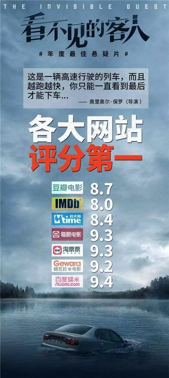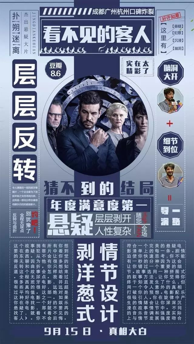 虽然这部电影本身的“营销点”有限,但电影除了明星“自来水”的助推外,电影凭借其宣发也让其口碑充分扩散。早在6月份第20届上海国际电影节上,西班牙悬疑电影《看不见的客人》入选“多元视角”单元,被作为重点推荐影片展映。