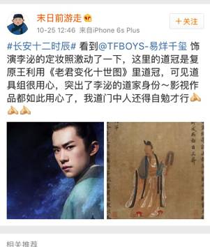 从多处细节都可以看出剧组对于传统文化的重视和用心,以这次发布的角色海报中李泌的扮演者易烊千玺头顶束冠的簪子为例,不同于常见的古装剧中横向插簪,而是竖向。看似插错了方向,其实这正是经过了严格的历史考据。