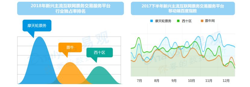 在行业市占率上,摩天轮票务也以绝对优势领先。据易观千帆数据显示,2018年1月摩天轮票务行业独占率超过同类票务平台独占率累计之和;而对比2017下半年新兴互联网票务交易服务平台移动端百度指数,摩天轮票务也大幅领先于同业伙伴。