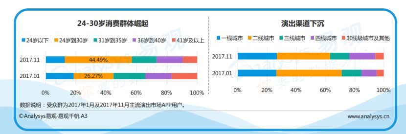 与电影票务市场另一点相似的是,演出渠道也正在逐步下沉。易观报告显示,2017年热门演唱会、话剧等项目只在一线城市、二线城市巡演的旧有格局正在逐渐被打破,这是因为近几年由于演出场馆在一线城市已有大量布局,出于成本考虑,部分企业开始将演出地点设置在成本相对较低的三线、甚至四线城市。