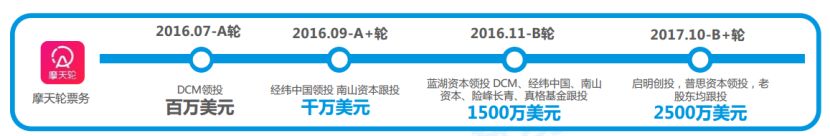 而在新兴互联网票务平台中,摩天轮票务占据领先位置。从2016年7月至今,摩天轮票务接连完成4轮融资,去年10月该平台完成的B 轮融资,由启明创投,普思资本领投,金额达到2500万美元。在同类平台的资本收割战中,摩天轮票务在融资速度、融资金额、股东实力方面更胜一筹。