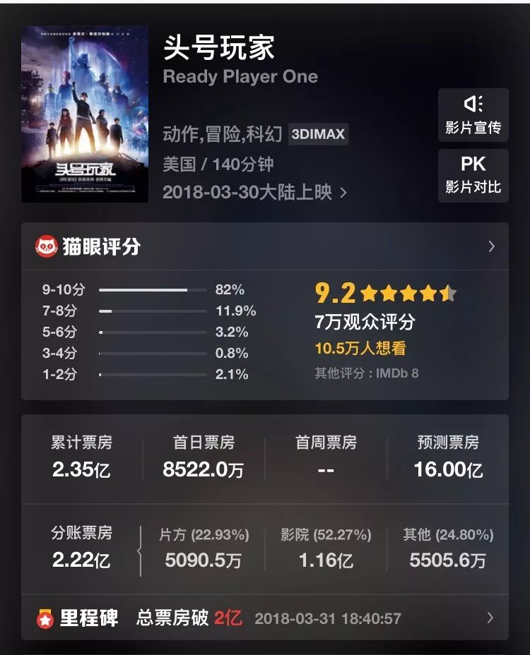 作为今年3月最后一部好莱坞大片,《头号玩家》不负众望。上映两天,该片票房达到2.35,综合票房占比65.3%,排片占比34.4%,上座率达到22.9%。猫眼预测其最终票房达到16亿,但从目前的势头来看,这份数据或将继续攀升。