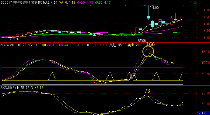 上图圆圈处SKDJ只有73还没有攻击到超买危险区,但是波段之星达到166,极度超买,先相信波段之星的信号。