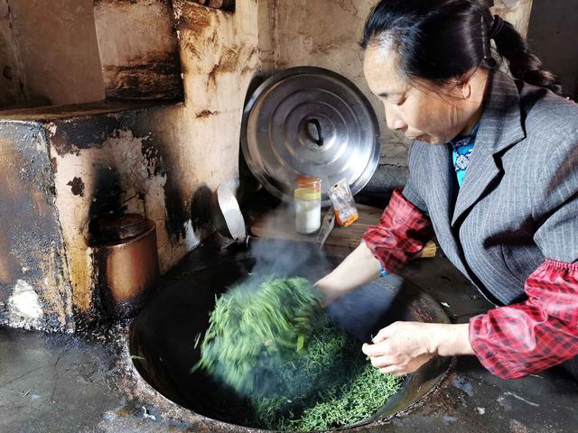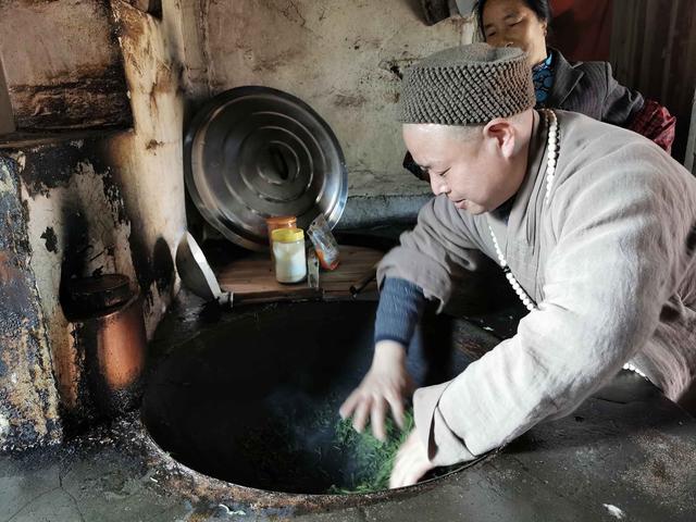 静心谷摘来的茶,在当地一位大姐家中制作,大大的铁锅,旺旺的柴炊,大姐身手敏捷,茶叶在滚烫的大锅中,用手不断翻滚。大姐说这个杀青,真担心大姐的手,会被烫伤,但她却说,做了几十年了,掌握到温度。太烫时,用竹筅帚与手,一起配合。