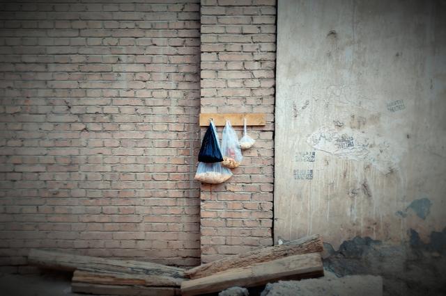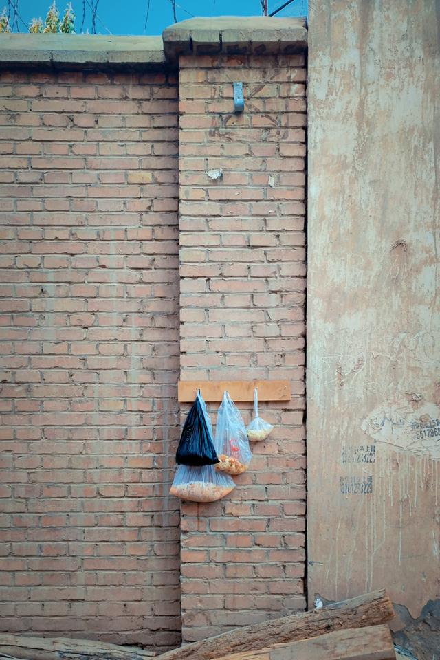 比如在古城内外的小路边,我经常看到墙上钉着这样的钉子板,上面挂着一些塑料袋,塑料袋里放的是一些食物的残渣。