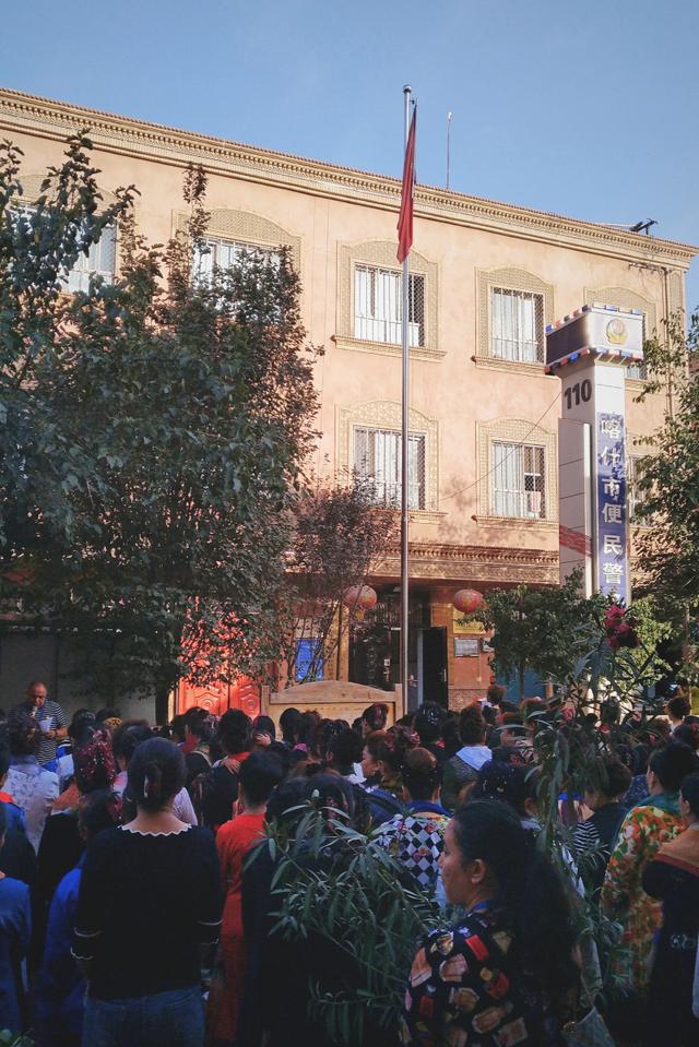 这里每周一都会有【升旗仪式】。升旗的流程和我们在内地参加的升旗仪式是一样的,奏国歌、目送国旗升到顶端、注目礼完毕。但是喀什人的站队方式和我们是不一样。