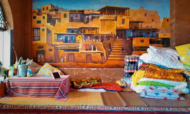 店里的硬装修都是这座楼本来的样子,软装被安排成浓浓的维吾尔族风情。靓丽的壁画、鲜艳的桌围和撞色的顶上装饰。