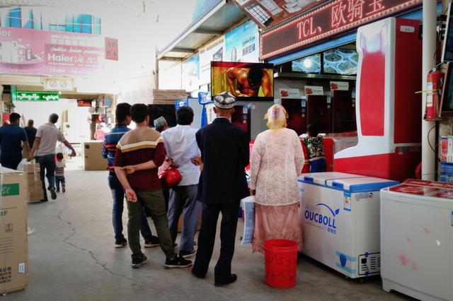 在售卖大型电器的商铺门口,几个喀什人扎堆观看着电视上播放的电影。