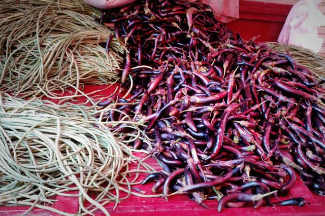 比如说喀什大巴扎里售卖的蔬菜,都是本地农民自己种植的,茄子是那种细长的茄子,不怎么好看,但是很好吃;豆角也是随便抓起一把、胡乱捆一捆就摆到摊子上卖了。