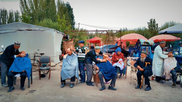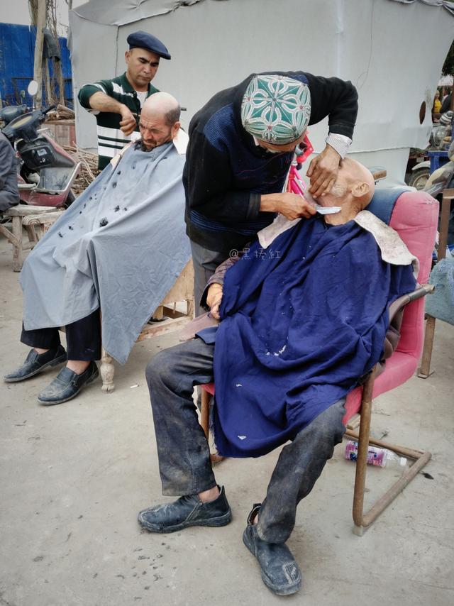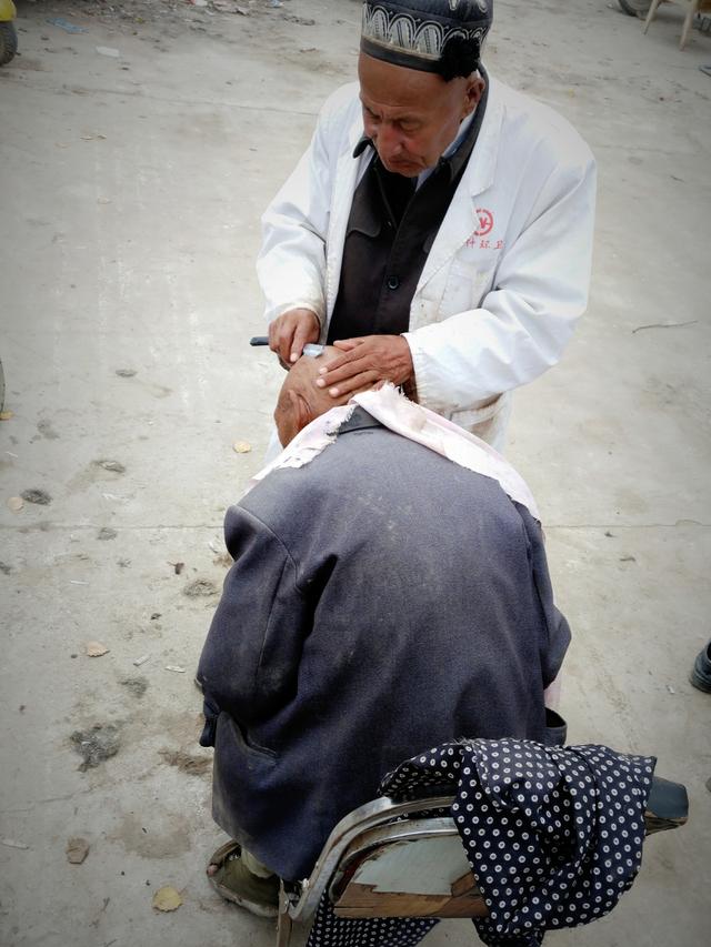 乌帕尔巴扎上有一个特别的摊位,就是剃头刮脸的场地。