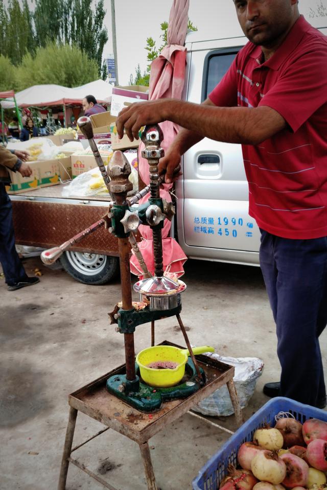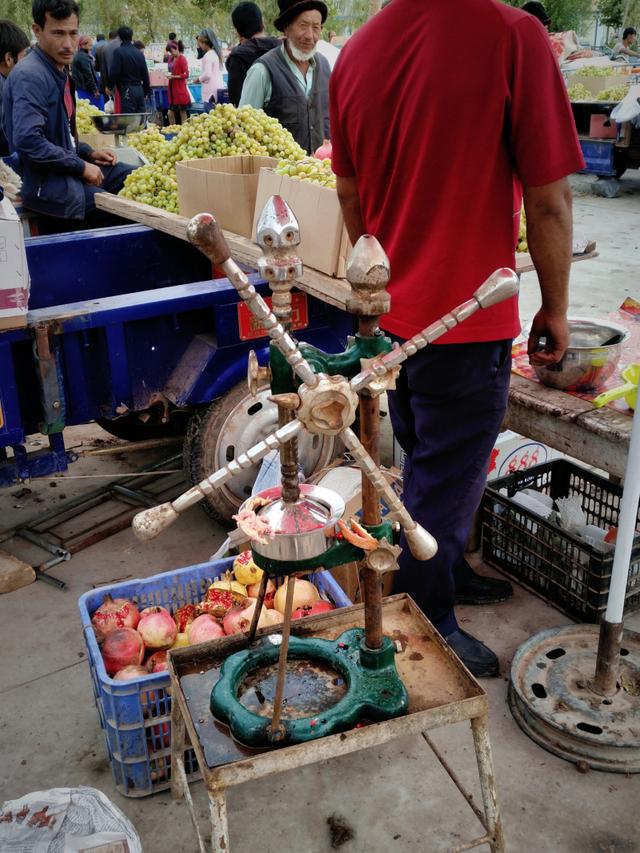 乌帕尔镇盛产各种水果,其中尤以石榴最多,下图的这个小机器就是石榴铺子里的榨汁机。