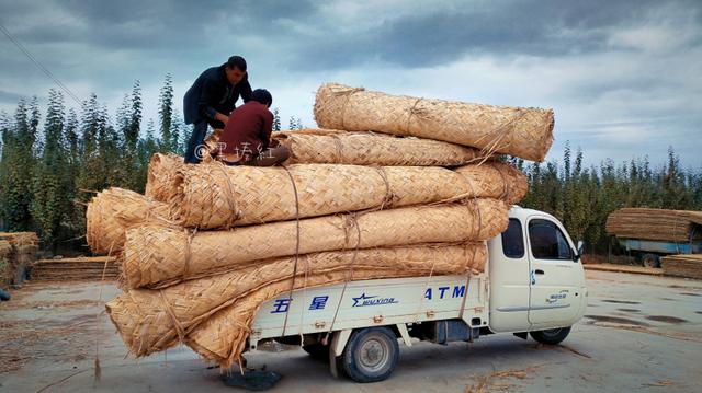 这种草席非常巨大,人们把它一片一片地卷起来,用小汽车的后斗拉走。