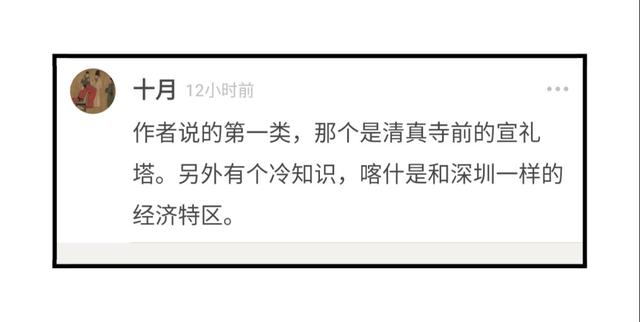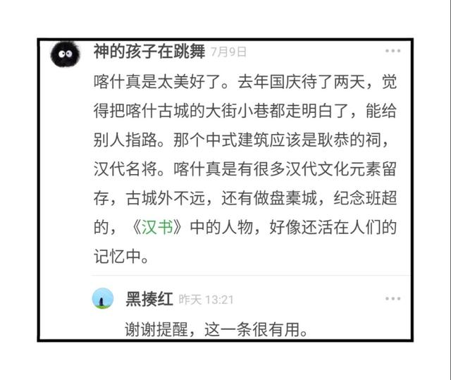 “喀什真是太美好了。去年国庆待了两天……那个中式建筑应该是耿恭的祠,汉代名将。喀什真是有很多汉代文化元素留存,古城外不远,还有做(座)盘橐城,纪念班超的,《汉书》中的人物,好像还活在人们的记忆中。”
