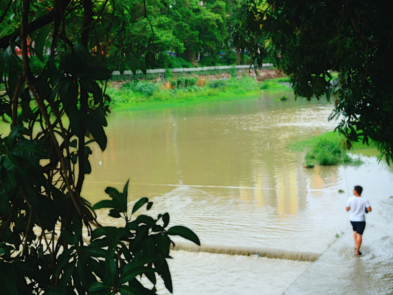 对岸有人在钓鱼,沿着河边来来回回寻找最佳垂钓位置。